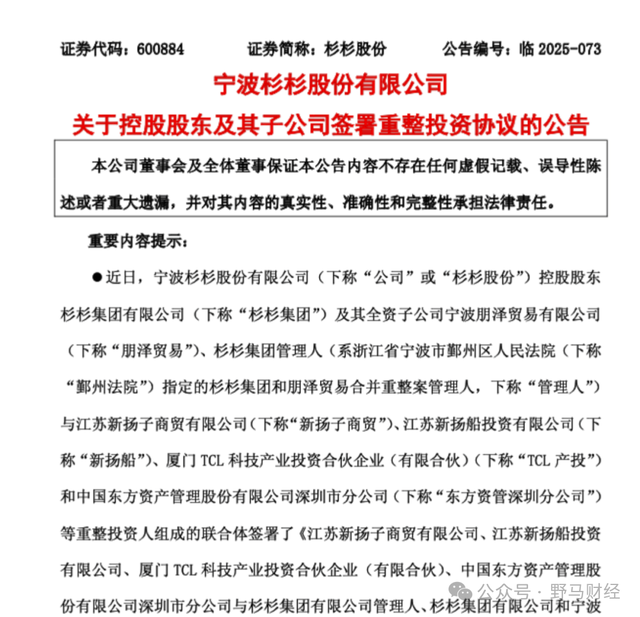 2025年9月30日,杉杉股份(600884.SH)发布公告称,杉杉集团及其子公司宁波朋泽贸易,已与新的投资联合体正式签署《重整投资协议》。