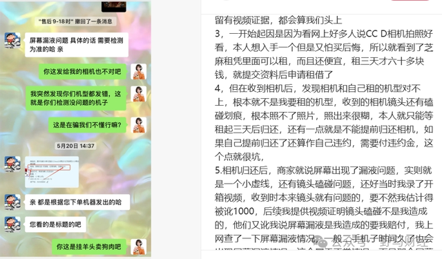 有网友表示,自己归还相机后只是机身有轻微掉漆,商家居然要索取540元的赔偿。还有在“花小猪租包”上租过LV包的网友表示,租了两次寄过来的包都不够新,第二次租完商家说寄回去的包爆皮了需要赔偿3000元,但他们寄过来时包就已经有爆皮痕迹了。