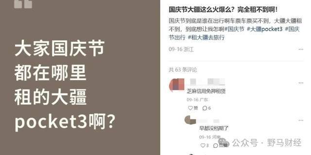 国庆前夕,“一生要出片”的年轻人四处搜寻得力的“拍照搭子”,那些携带方便、滤镜强大的热门相机都在被争先预定;不少网友在社媒平台上吐槽,在租赁平台上找很多商家想租大疆Pocket3,但全都没档期了,“车票买不到,相机现在也这么难租。”