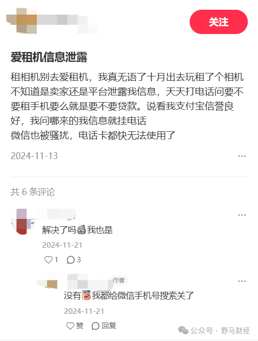 曾有网友提到,自己在爱租机租过一次相机后,经常接到陌生电话问要不要办贷款、租手机,微信也被骚扰,最后不得已关掉了微信手机号搜索。黑猫投诉平台还有用户提到,有些商家会擅自收集、过度收集消费者的情况,要求租客出示身份证正反面照片、甚至社保信息。