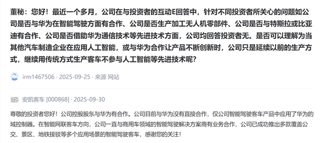 9月30日,“是否可以理解为当其他汽车制造企业在应用人工智能,或与华为合作让产品不断创新时,公司只是延续以前的生产方式,继续用传统方式生产客车不参与人工智能等先进技术呢?”对于关于与华为合作方面的问题,安凯客车(000868)在互动平台回复称,公司控股股东与华为有合作。