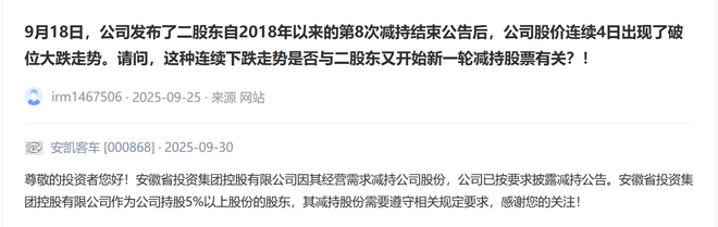 股价表现上,有人急问“9月18日,公司发布了二股东自2018年以来的第8次减持结束公告后,公司股价连续4日出现了破位大跌走势。这种连续下跌走势是否与二股东又开始新一轮减持股票有关?”