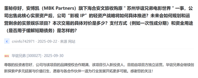 9月30日,“公司出售此核心实景资产后,公司影视IP的轻资产战略将如何具体推进?未来会如何规划和运营剩余的实景娱乐项目?”对于海合安文旅收购原“苏州华谊兄弟电影世界”一事,华谊兄弟(300027)在互动平台进行回复。